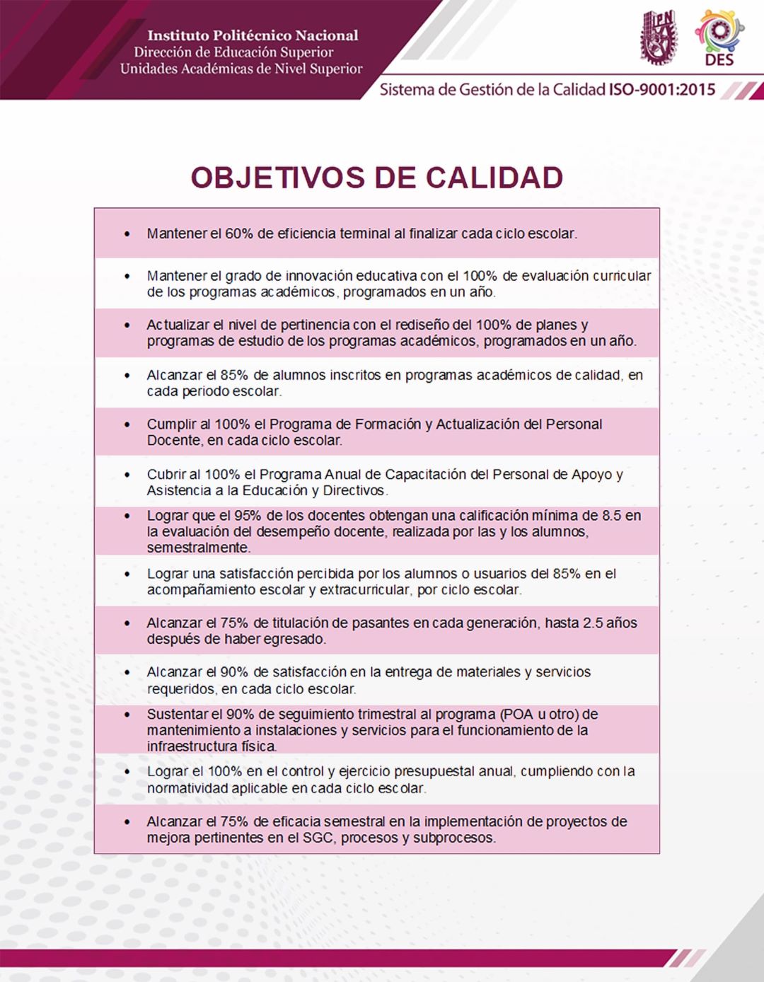 Nuestro compromiso es asegurar servicios educativos de calidad, mediante la oferta de programas académicos pertinentes, que logren la satisfacción de las y los alumnos, en su formación integral como profesionistas competentes, para contribuir al desarrollo científico, tecnológico, cultural y socioeconómico del país; sustentado en el cumplimiento de los requisitos normativos aplicables y en el mantenimiento de la mejora continua.