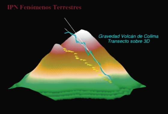 En la figura siguiente se muestra una serie de datos gravimétricos en el volcán de Colima (campaña IPN, 2010). Es clara la diferencia de la tendencia de los datos de gravedad en las lejanías del cráter y en sus cercanías (líneas blancas).